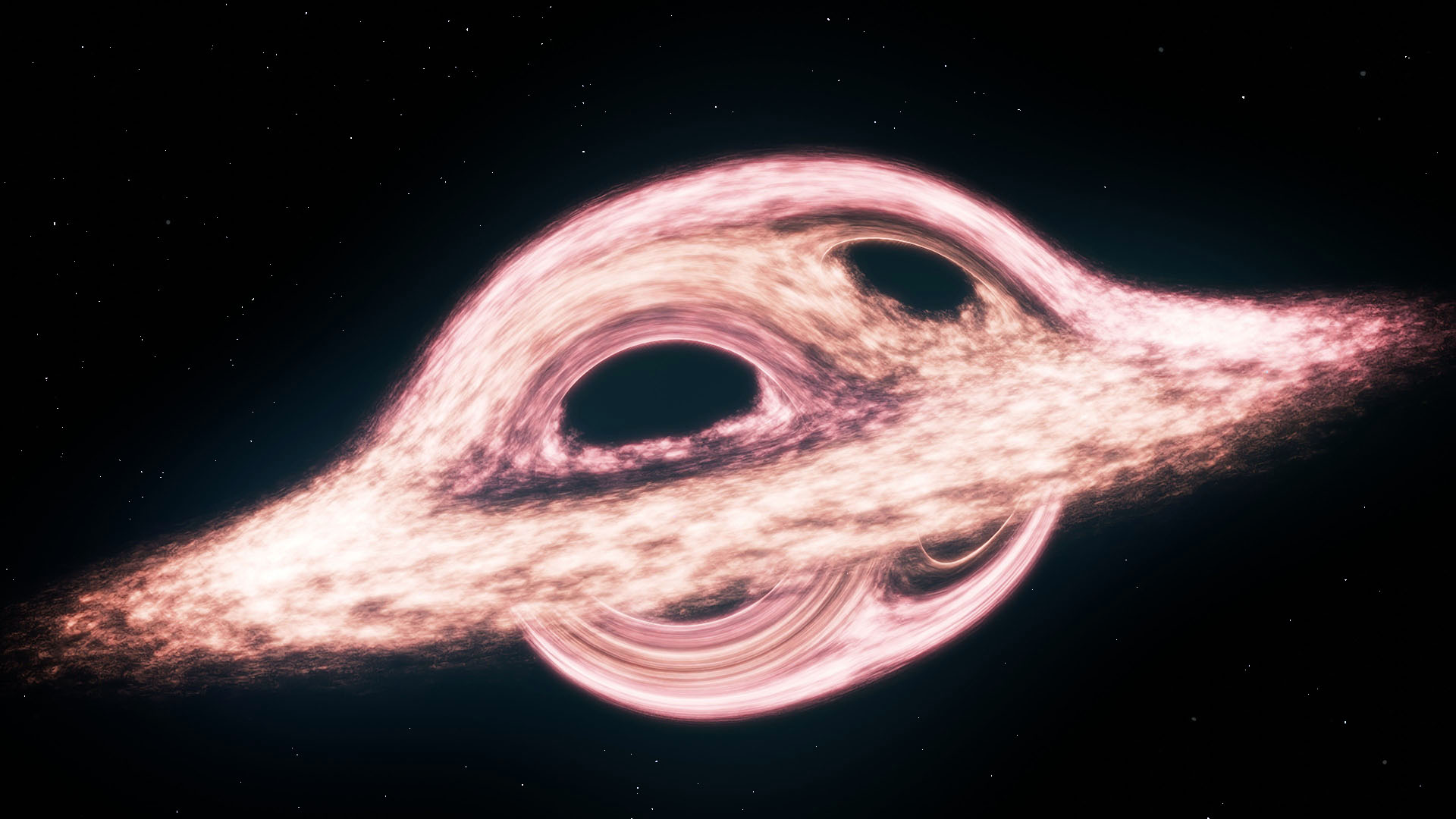 The Schwarschild solution can be used to describe what is known as a Schwarschild black hole (this is what you see in the render). This model takes the black hole as having no charge (like a neutron) and no spin. No spin is a key point. This means the black hole is perfectly spherical. The fact that all observed things in the Universe move and spin, and through logical deduction, the likelihood that a black hole has no spin is zero to none.