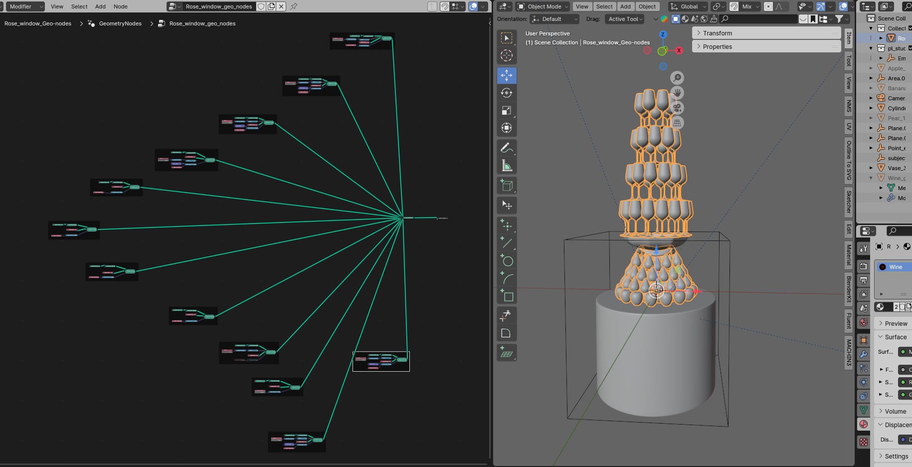 So today that is what I started doing. I had a thought about extending that geometry node set-up so I could build ‘up’, as well as ‘out’. So I set about it and modelled what you are seeing in this post. I also wanted to demonstrate this with something ‘quirky’…just for fun😊. So I built a ‘Tower of Fruit & Wine’. now I know when you look at this tower it is most probably physically impossible…but that is the great thing with Blender! You can make the impossible ‘possible’, and that is why I love this work.