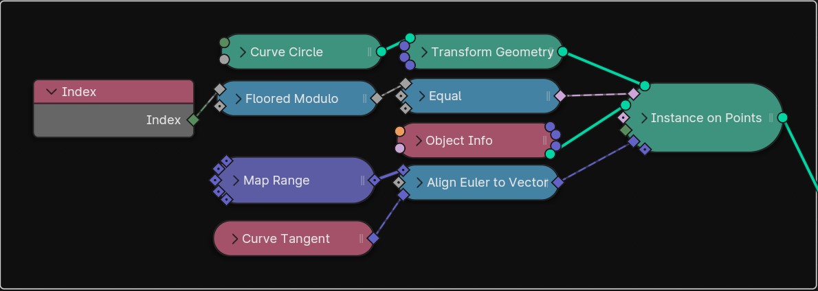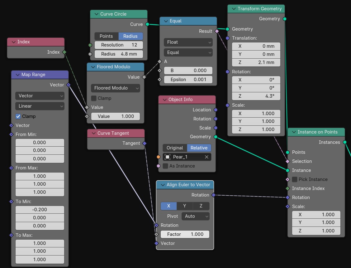 - The two blue ‘Math Nodes’, in this case the ‘Floored Modulo’ and ‘Equal’ nodes, feeding into the Selection input of the ‘Instance on Points’ are used if we want to skip or subtract some of the instances. In this case we are just instancing all 12 Pear_1 Objects.