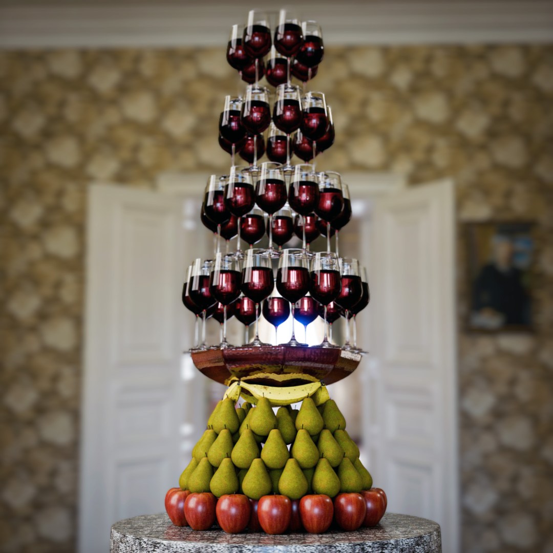 So lets have a quick look at this twelve layer geometry node set-up for the Fruit & Wine Tower in the rendered image: