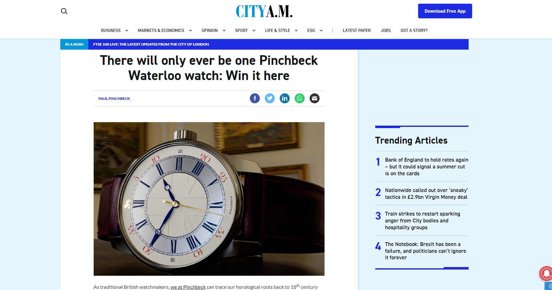My Waterloo Watch Design is Published in ‘City AM’ – The Business Publication for London UK.