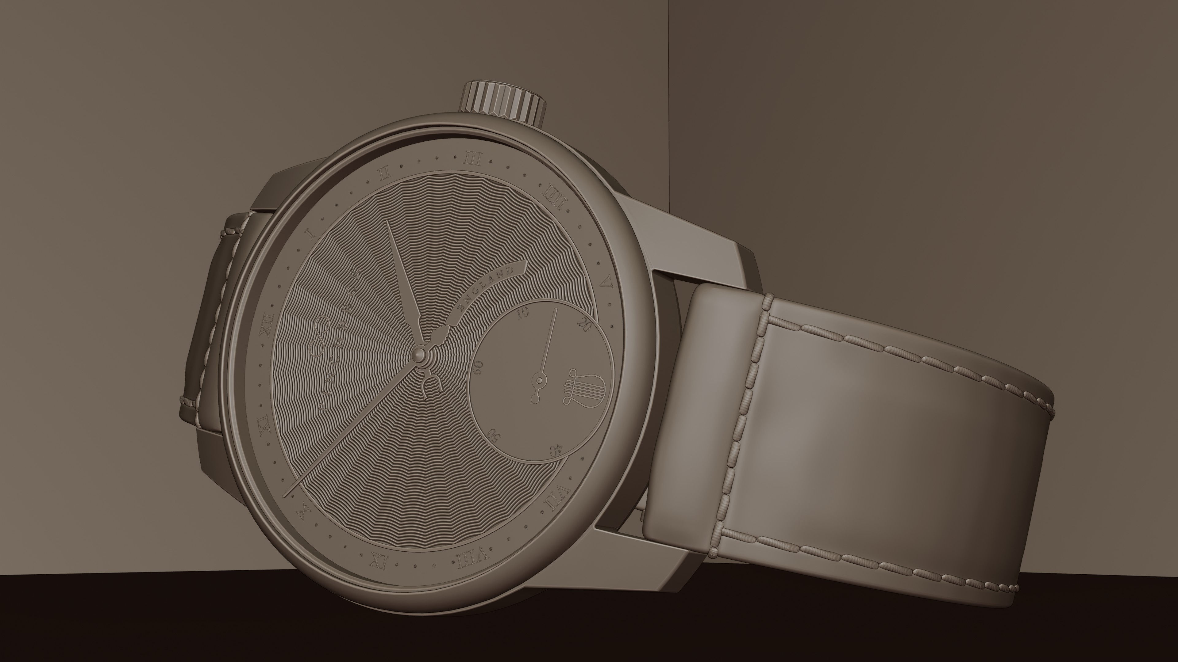 To give you some idea, here is a basic-clay shot of the mesh-model of the watch, with no materials etc applied: