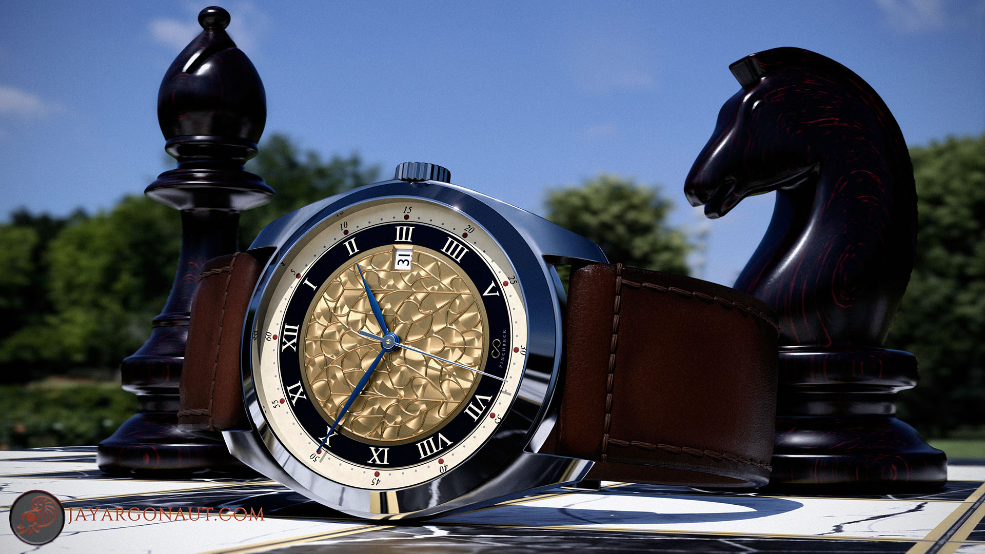 The Lindum watch designed by Jason Garth Edwards. A still-life display on Chess board with Chess pieces. All models are designed by Jason Garth Edwards - built, modelled, and rendered by Jason using Blender 4.0