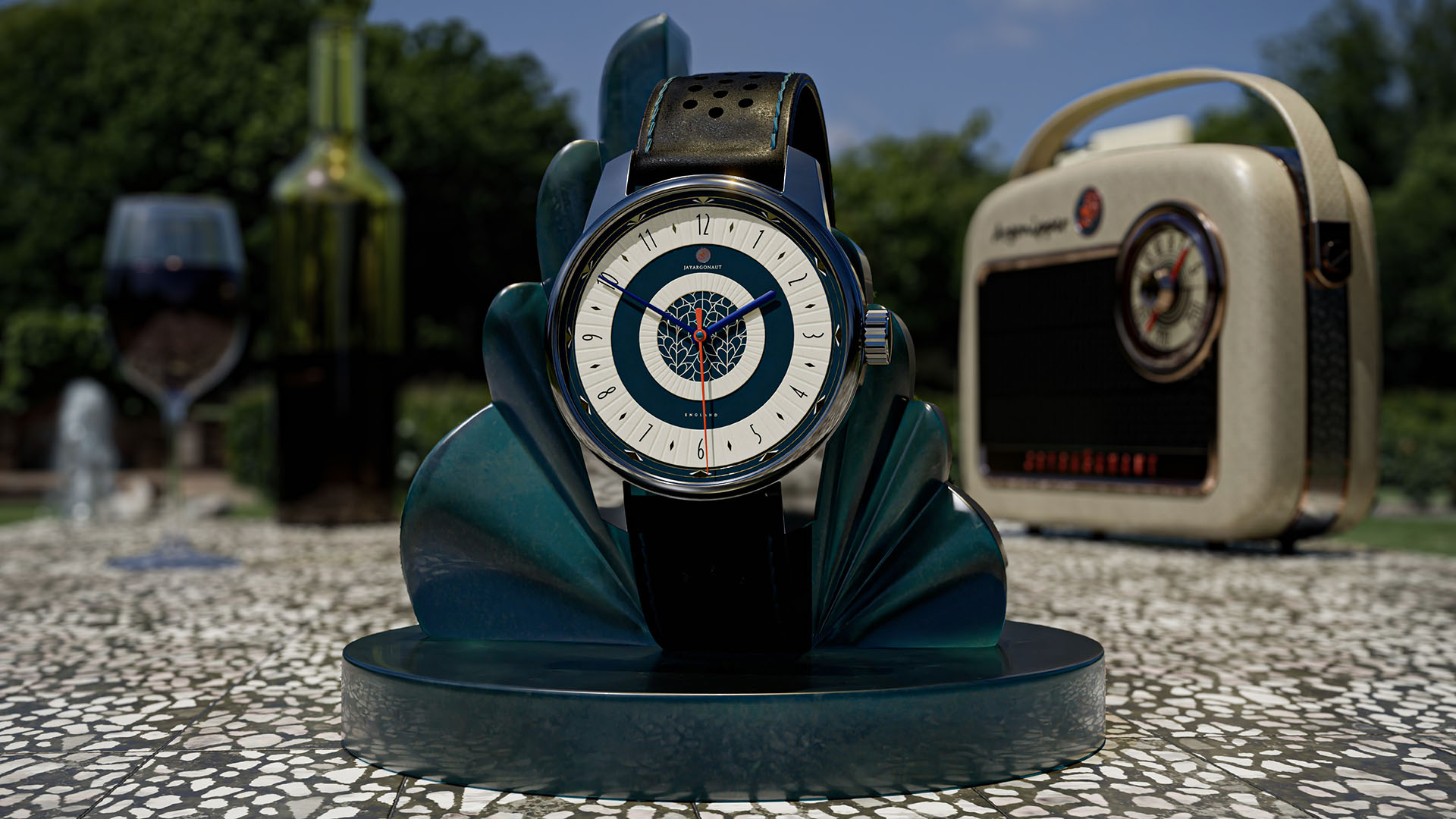 A retro styled concept watch in kitchen still-life scene. Designed & rendered in Blender 4.2 using AGX colour managament by Jason Garth Edwards at www.jayargonaut.com